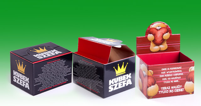 Opakowanie do bardzo dużego kubka z możliwością prezentacji zawartości. Zamknięcie dzięki dodatkowym bigom i nacięciom składa się w maly prezenter na froncie opakowania, który po otwarciu pokazuje zawartość oraz tworzy mini toper z reklamą produktu. Do naprawdę dużego kubka.